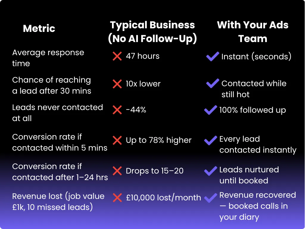 We eliminate the problem of losing sales due to slow response times. Our system ensures instant follow-up to prevent leads from going to a competitor, saving businesses thousands in lost revenue (e.g., typical business loses £10,000/month on 10 missed leads).